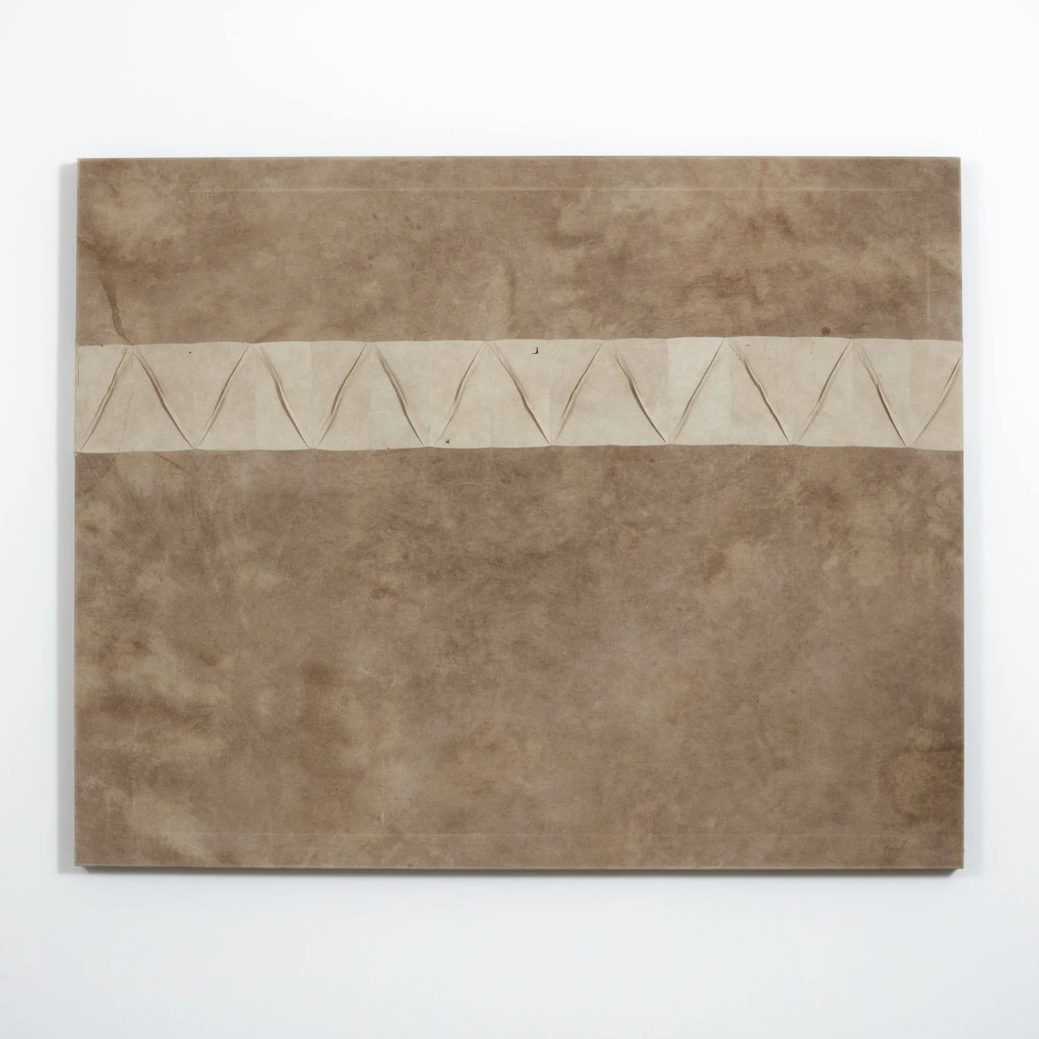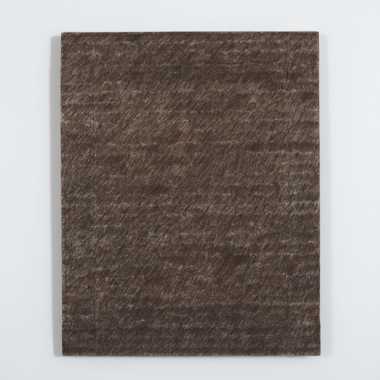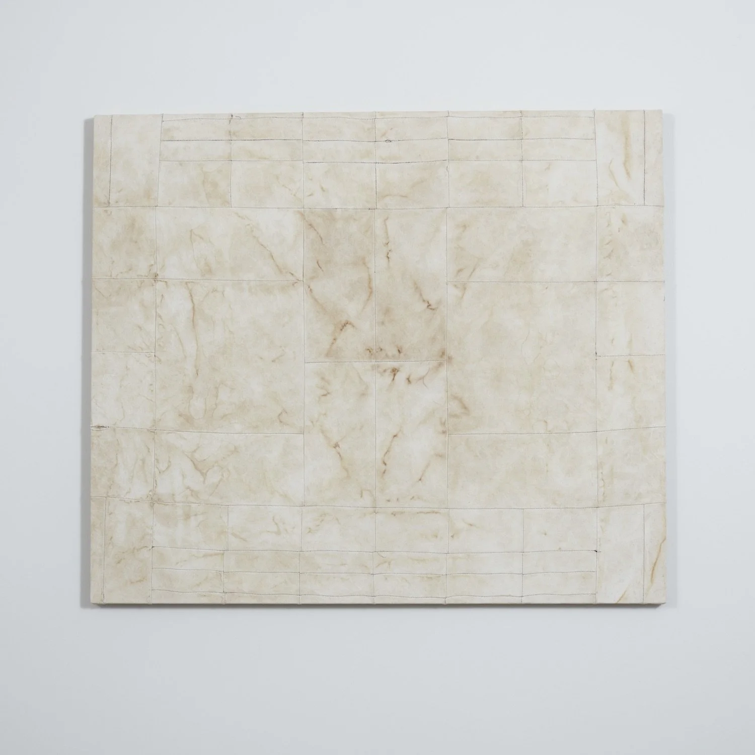 Drawing on his childhood, a personal, intuitive view of the emotional landscapes in the boggy, dark, roke-set peat fields of the Fenlands, Suffolk. He figuratively speaking, digests the materials in his practice. Sewing, natural dye’s (wort/tanin/fustic/iron ferrous sulfate, soil), repetition throughout a grid system and distressing material i.e scorching, erasure, submersion and bleaching. Aims at imbuing the surface with utterances that have fallen short or are inaudible, in an attempt to find expression outside of literary language. He states, “Language is a virus. Embattled with the implicit failure this sentence insures. I must become a warrior of my own self consciousness. I move my body, to move my mind, to spin the spur of the moment.”