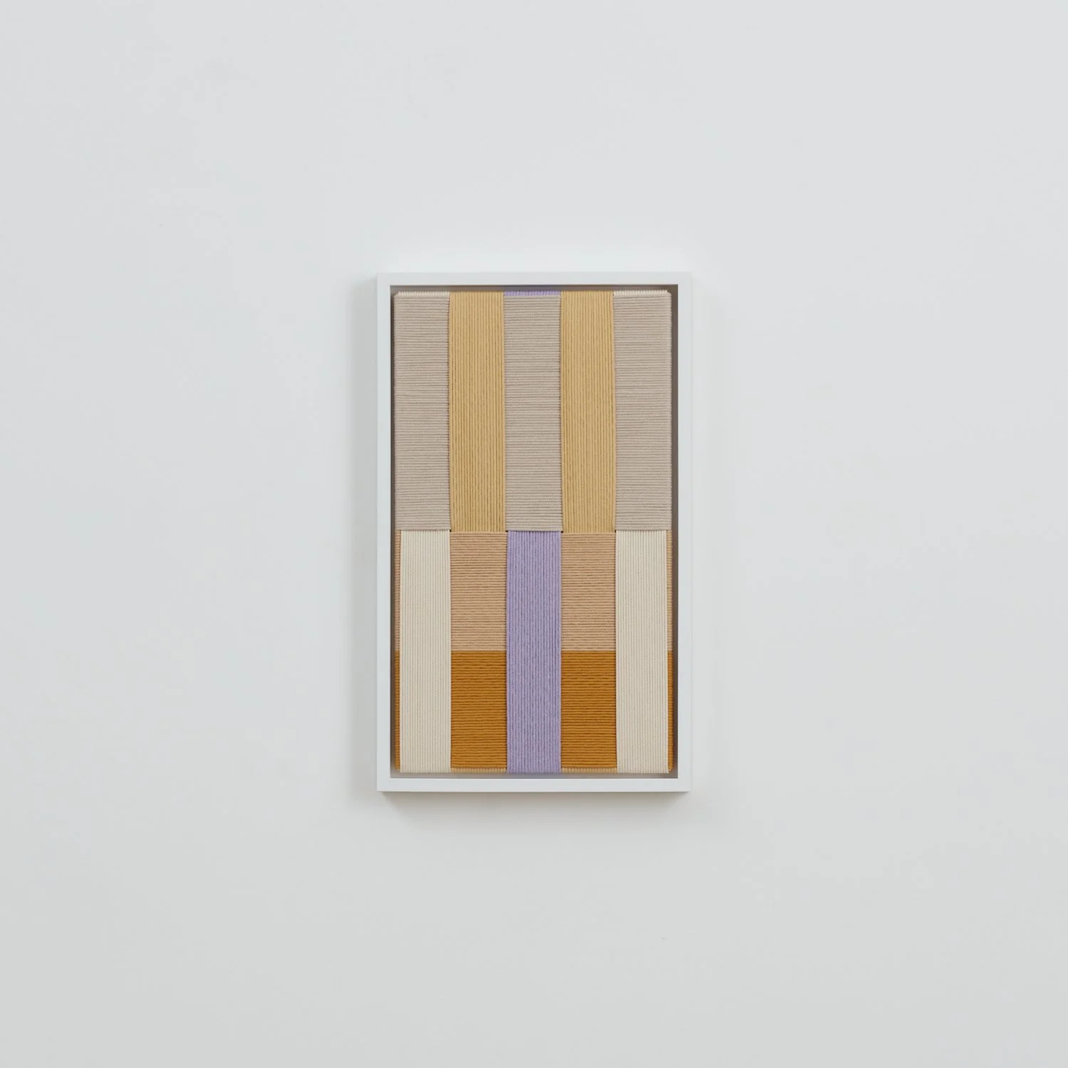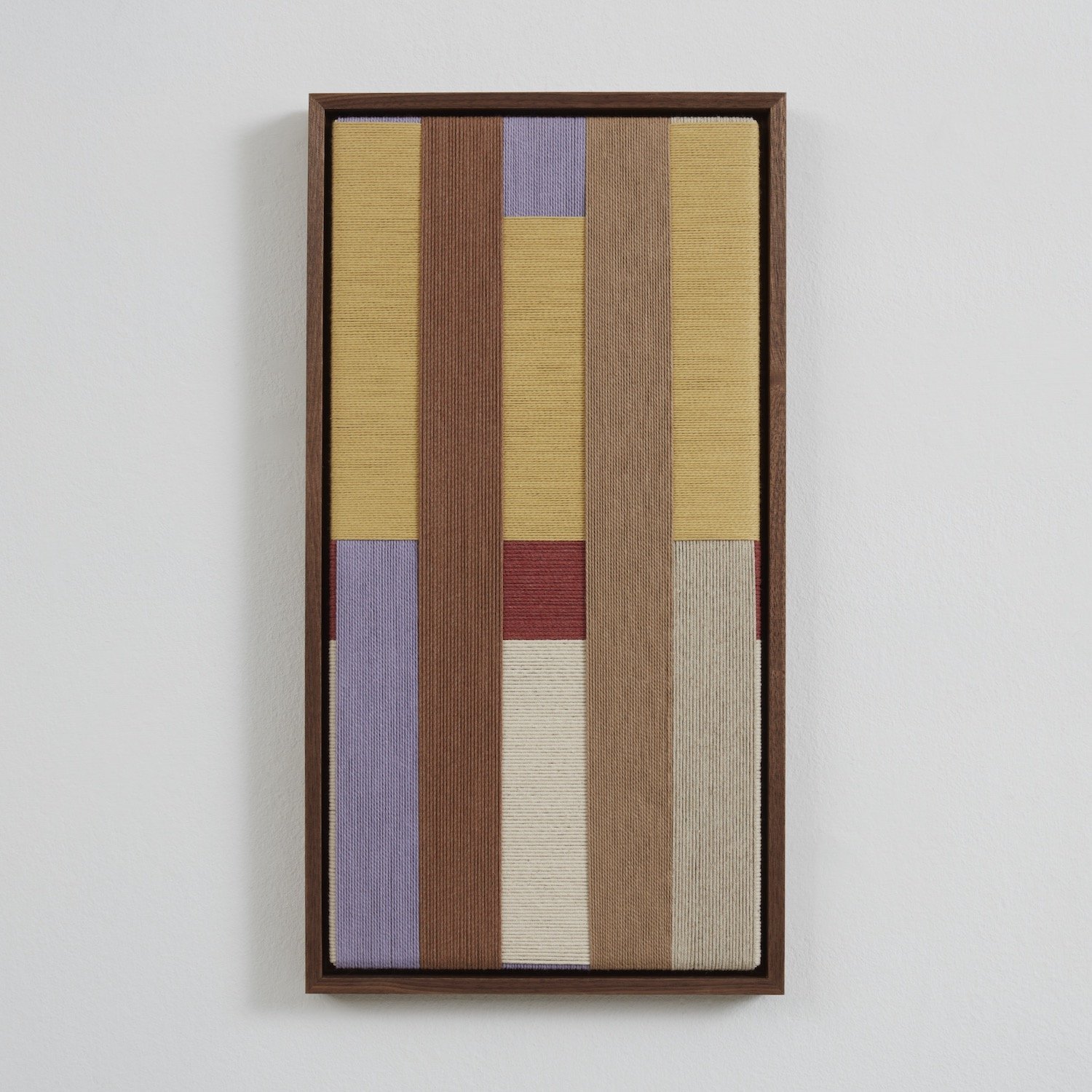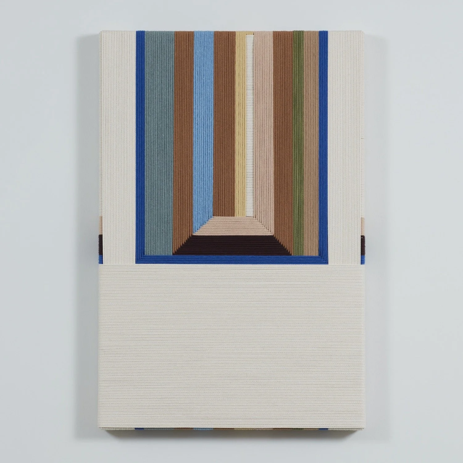 Jo Elbourne has been making taut and layered textile works since 2015. Her pared-down practice explores - both literally and figuratively - the notion of managing tension, and plays with the possibilities of line and colour whilst using a singular material and a simple yet exacting technique. Elbourne creates the surface of each piece in iterative movements - an absorbing back-and-forth - wrapping cord row by row to form considered asymmetric arrangements and intersecting pathways. Despite the apparent constraints of working only along parallel and perpendicular lines, the method yields images of subtle depth, reading as blocks of abstraction and at the same time inviting the viewer to consider the cord's journey around the frame as a narrative in itself.