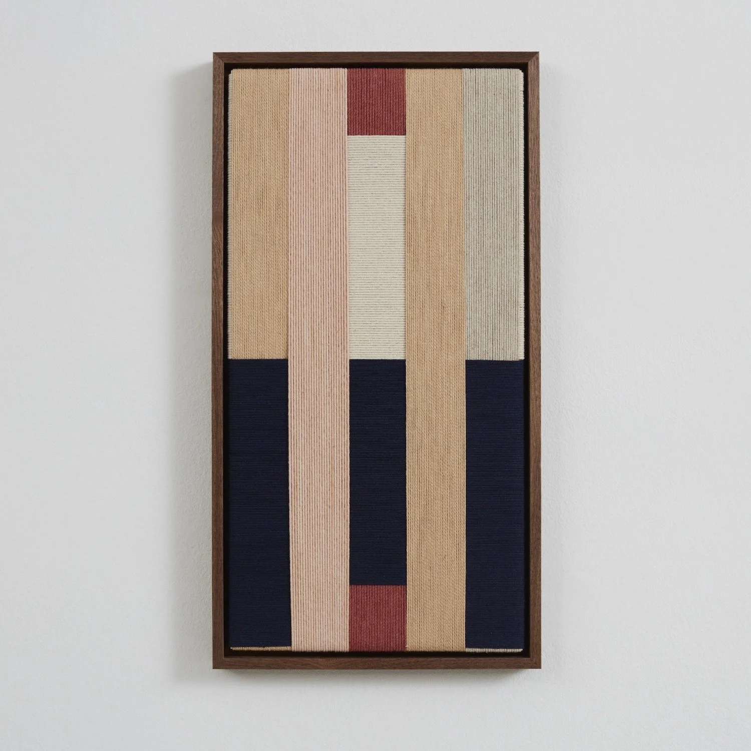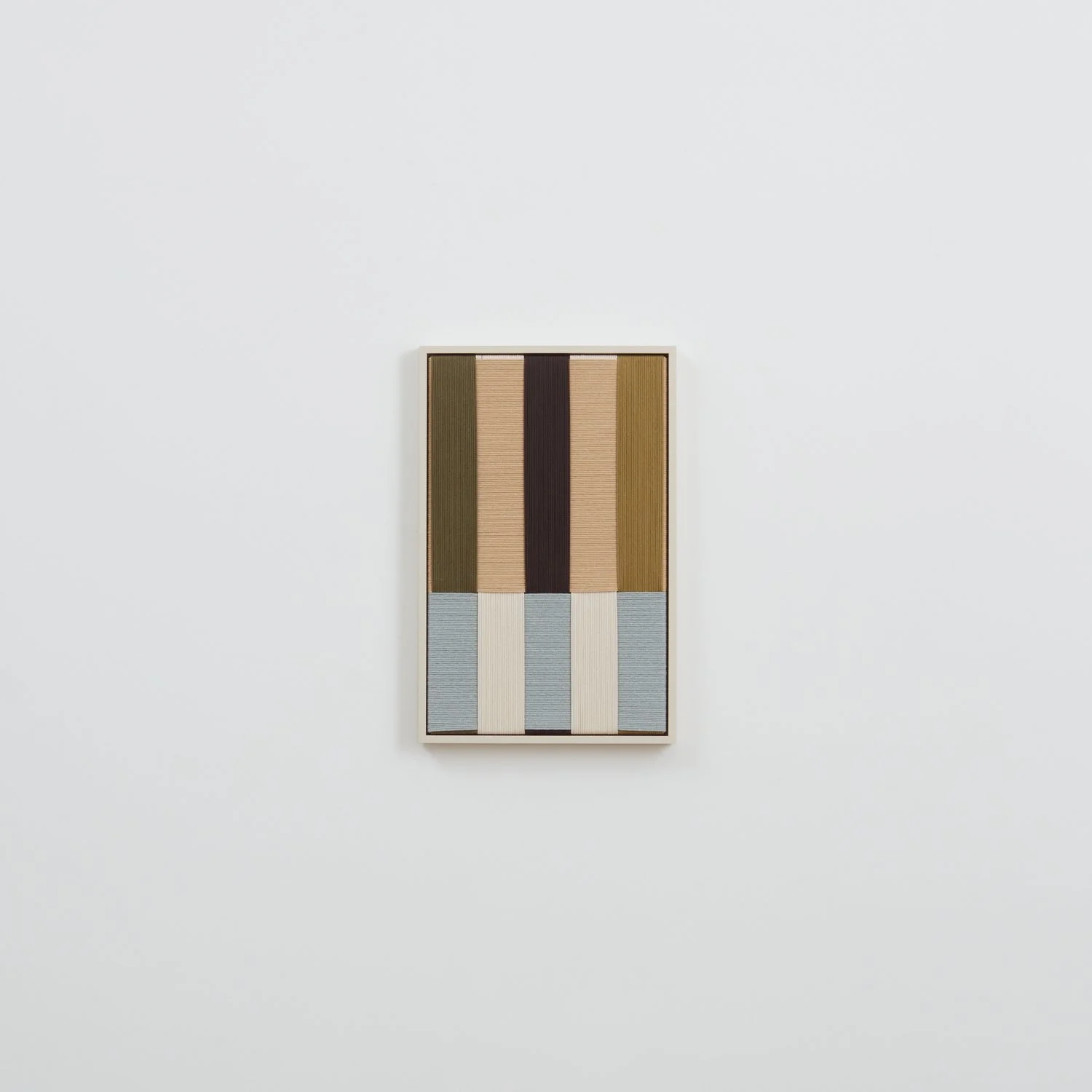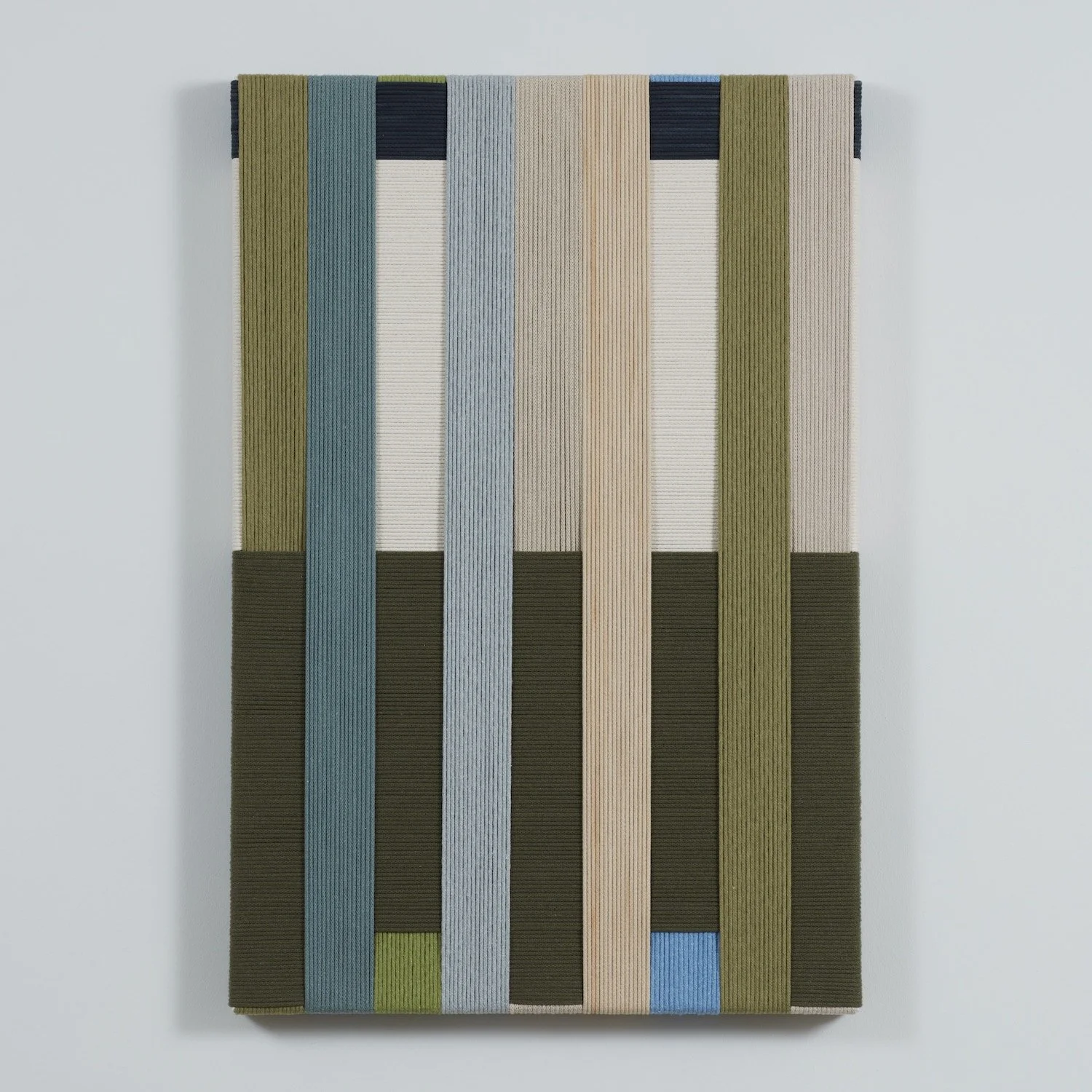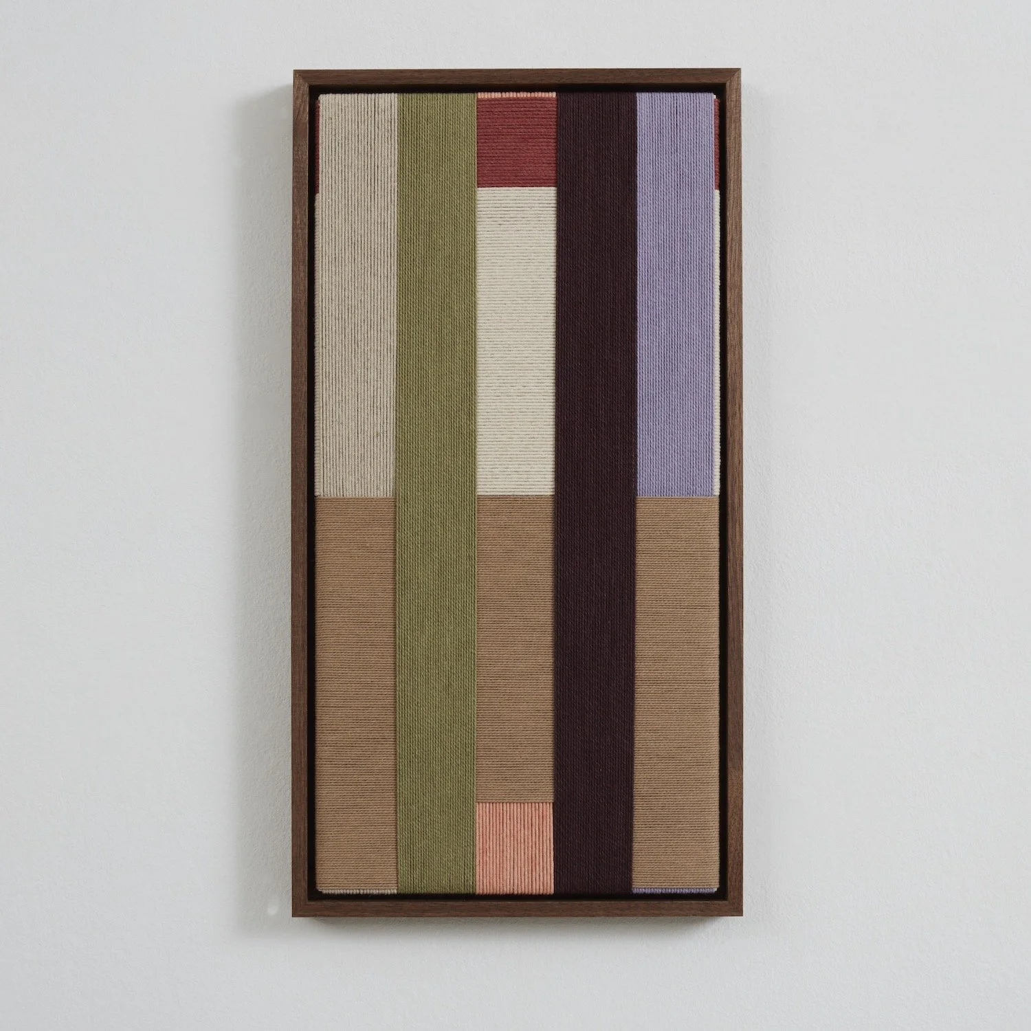 Jo Elbourne has been making taut and layered textile works since 2015. Her pared-down practice explores - both literally and figuratively - the notion of managing tension, and plays with the possibilities of line and colour whilst using a singular material and a simple yet exacting technique. Elbourne creates the surface of each piece in iterative movements - an absorbing back-and-forth - wrapping cord row by row to form considered asymmetric arrangements and intersecting pathways. Despite the apparent constraints of working only along parallel and perpendicular lines, the method yields images of subtle depth, reading as blocks of abstraction and at the same time inviting the viewer to consider the cord's journey around the frame as a narrative in itself.