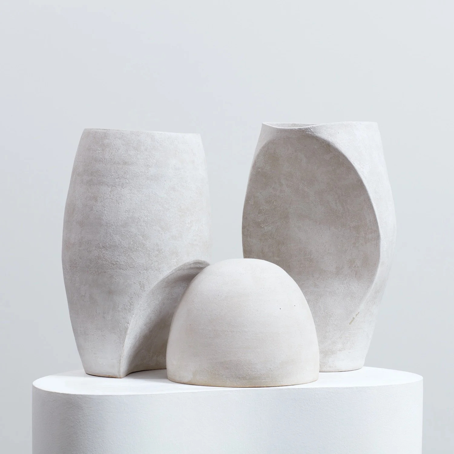 Bikis’ work blurs the boundary between sculptural objects and functional vessels, her studio practice incorporates research into form, focusing on altering wheel-thrown pieces, slicing them, and hand building back into the shapes. These pieces explore the relationship between the perfection of the wheel and the mark of the maker’s hand. Predominantly they are created to work together as groups or pairings, with the focus on both the spherical, flowing forms and the negative space between the altered works. Together with slip and underglaze, the work evokes a sense of tactility and recalls the qualities of the ancient earth they were made with.